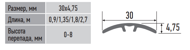 Порог из ламинированного алюминия шириной 30 мм со скрытым креплением. Имеет продольную жесткость. Применяется для соединения стыков между плиткой, ламинатом, паркетом и ковровыми покрытиями, имеющими перепад до 8 мм. На самоклеющейся основе.