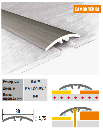 Порог из ламинированного алюминия шириной 30 мм со скрытым креплением. Имеет продольную жесткость. Применяется для соединения стыков между плиткой, ламинатом, паркетом и ковровыми покрытиями, имеющими перепад до 8 мм.