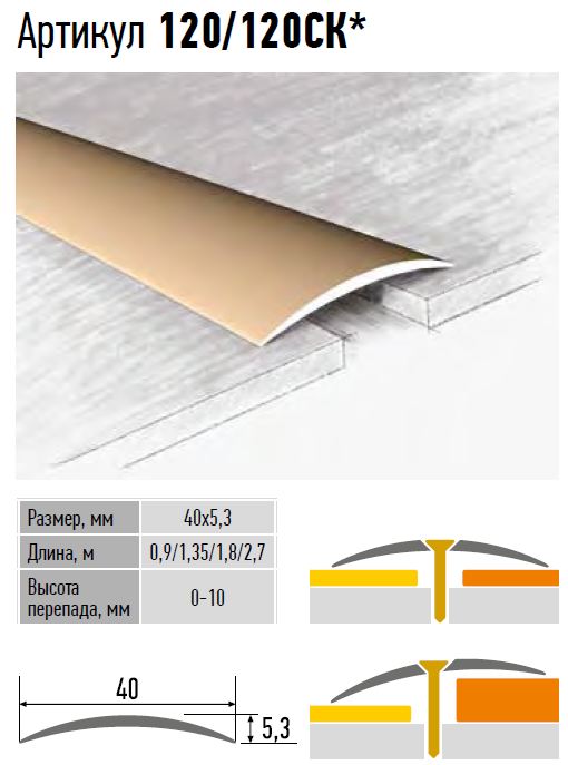 Порог алюминиевый КТМ-2000 120-08K 0,9 м титан – полукруглый профиль шириной 40 мм. Имеет продольную жесткость. Применяется для соединения стыков между плиткой, линолеумом, ламинатом, паркетом, ковролином с перепадом до 10 мм. Открытая система крепления. Степень нагрузки: для общественных помещений, для офисных помещений, для жилых помещений.