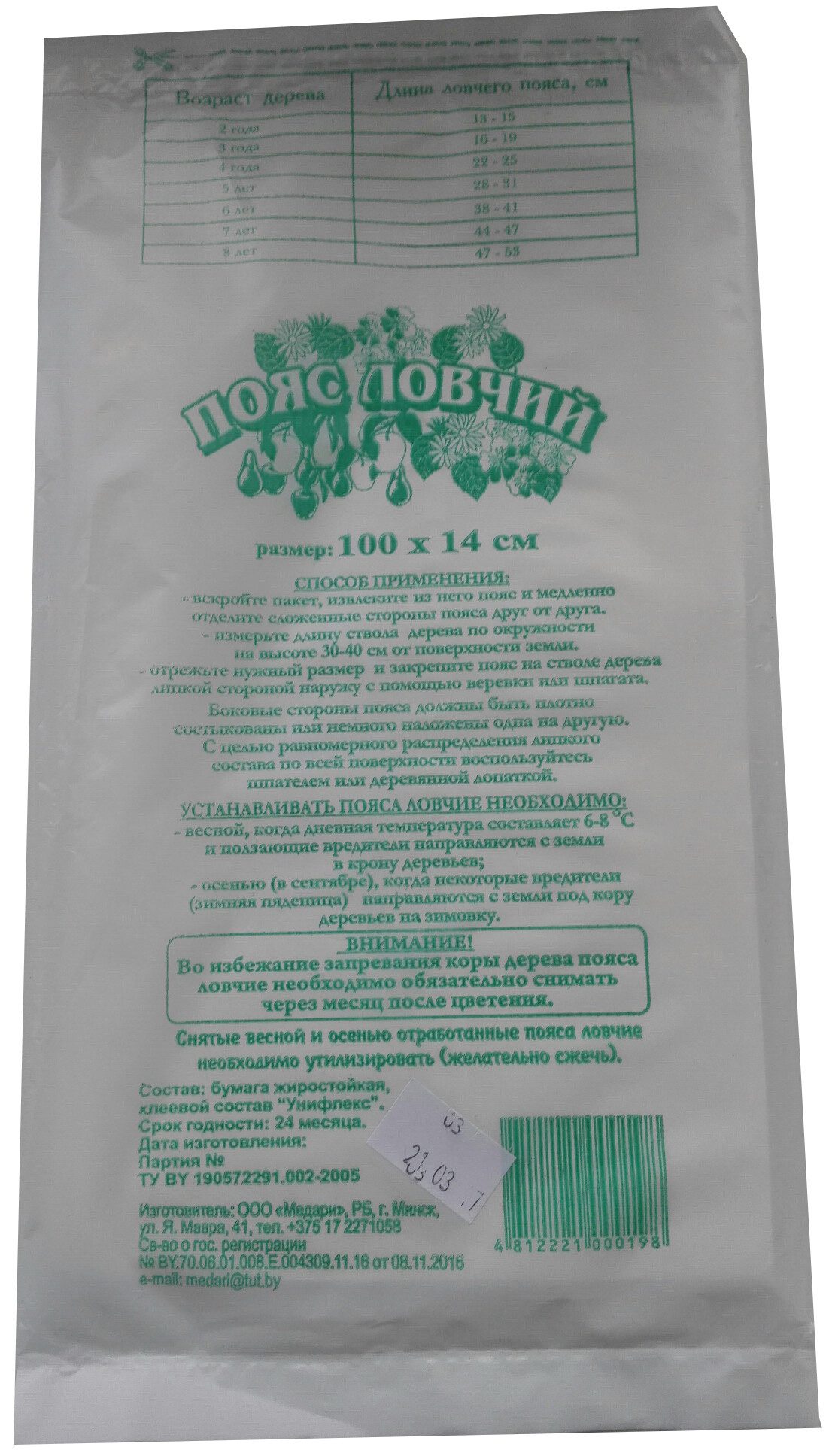 Пояс ловчий МЕДАРИ 100х14 см предназначен для защиты плодовых деревьев от ползающих вредителей (муравьев, жуков-долгоносиков, яблочного цветоеда, сливовой и яблочной плодожорки, гусениц и др.).Обмотайте пояс вокруг ствола на высотре 50 см от земли, чтобы один край немного заходил на другой.