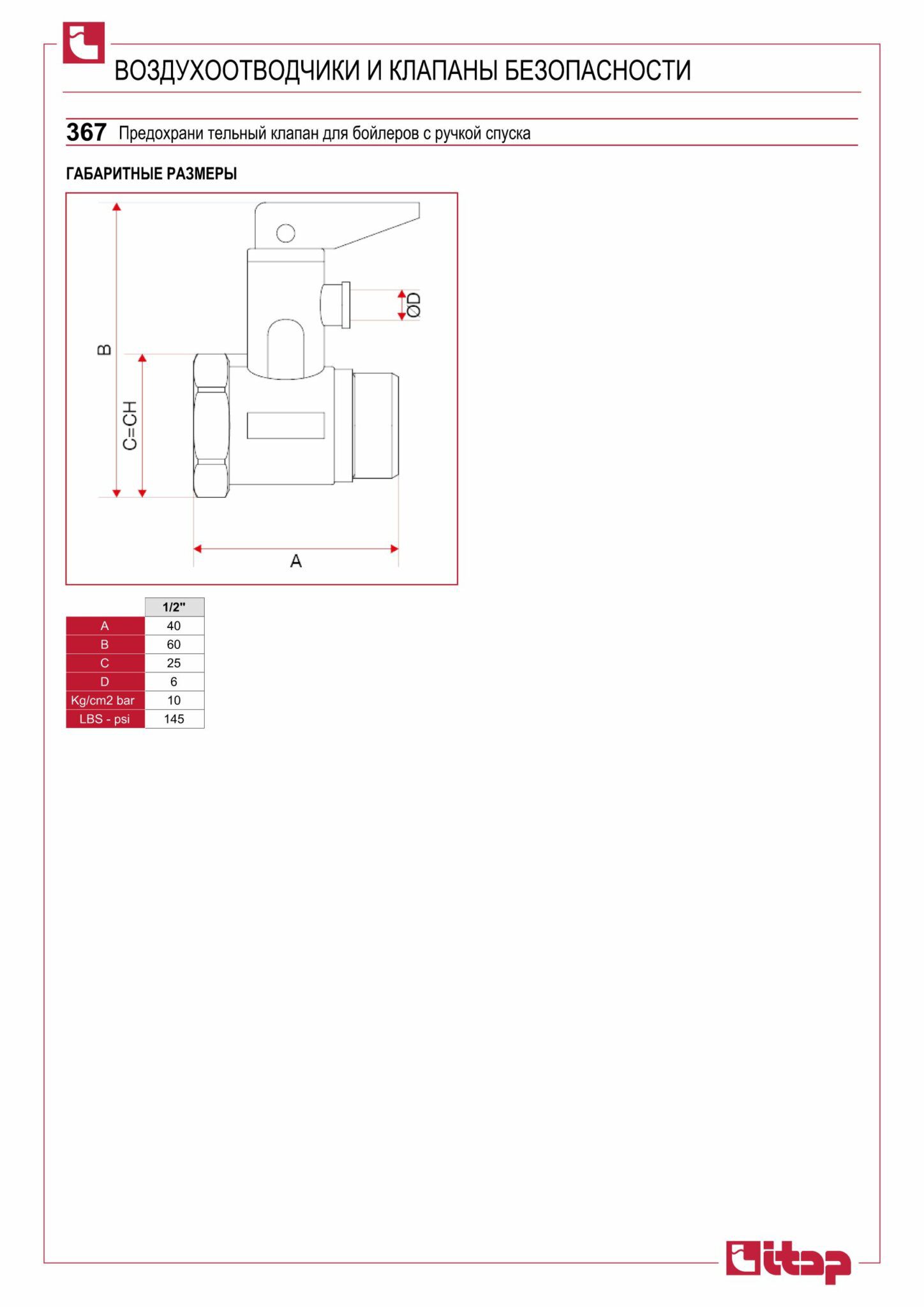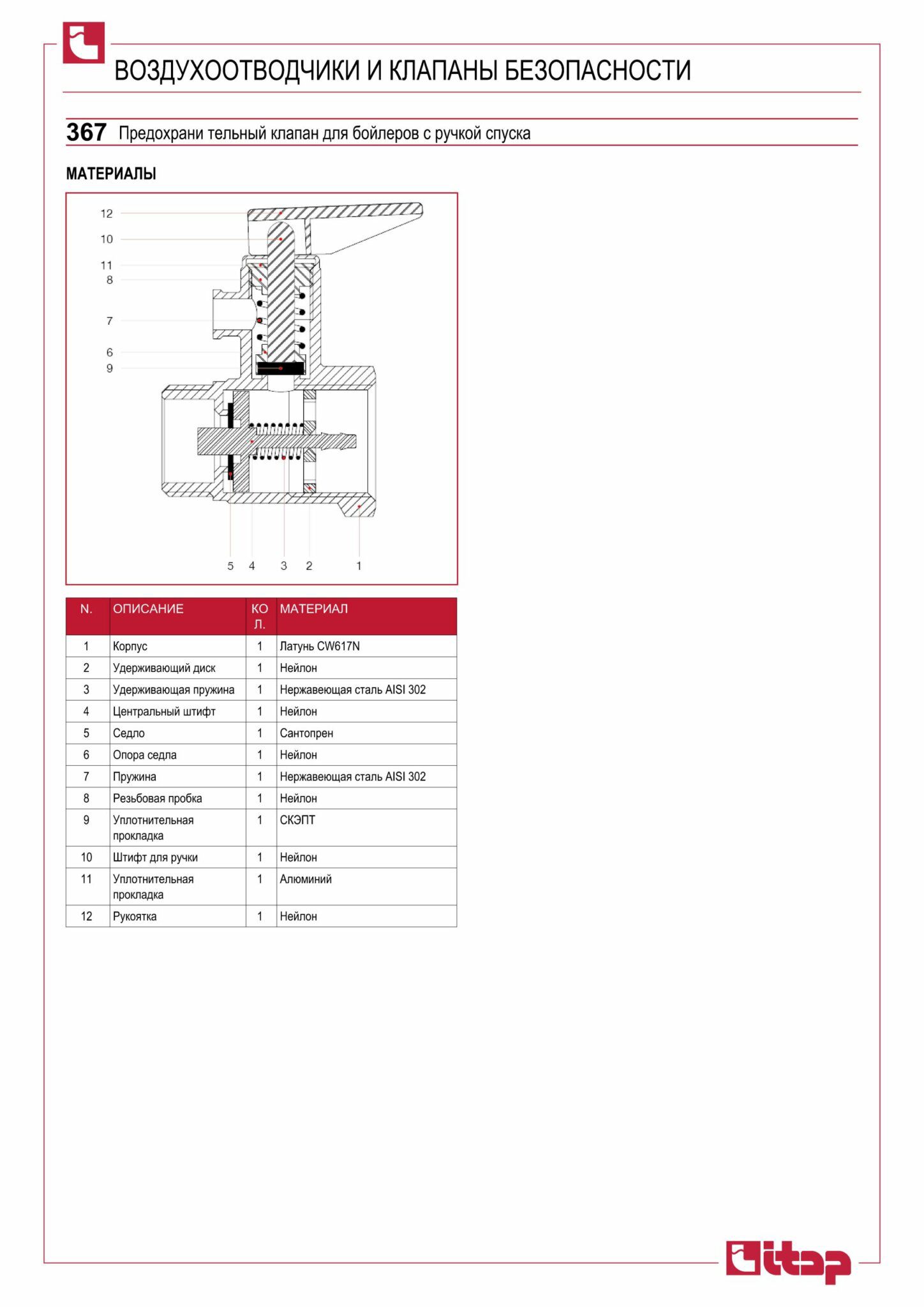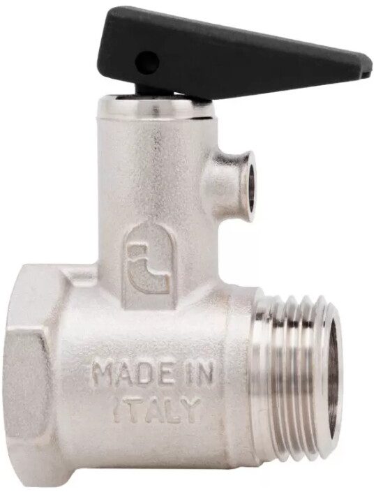 Предохранительный клапан 1/2″ DN15 ITAP (3670012) подходит для для бойлеров с ручкой спуска. Корпус клапана изготовлен из никелированной латуни. Пружины – из нержавеющей стали. Седло из нейлона. Уплотнения из NBR. Максимальная рабочая температура: 120°C. Уставка: 8,5 bar. Резьбы: ISO228 (эквивалентно DIN EN ISO 228 и BS EN ISO 228).