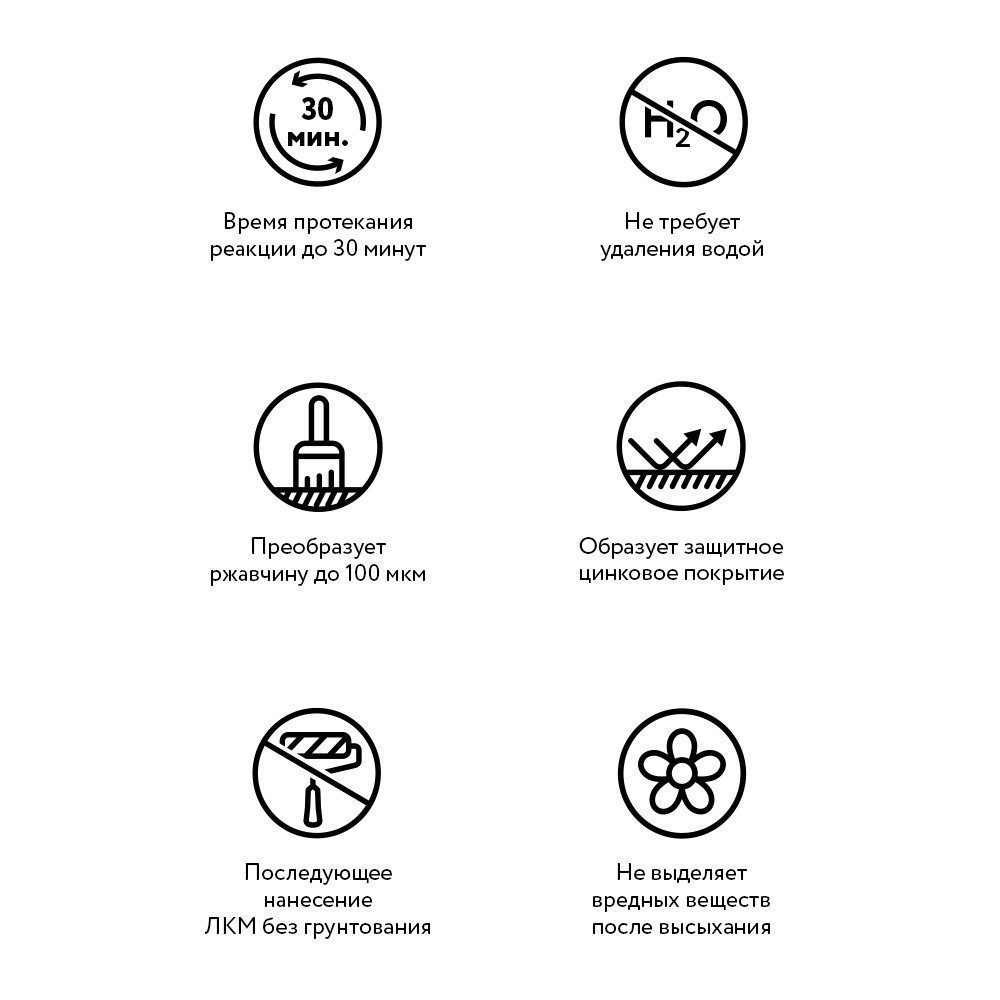 После применения средства на поверхности ржавого металла происходит химическая реакция, в результате которой образуется цинко-фосфатное покрытие. Последующее нанесение ЛКМ на места, обработанные преобразователем, может производиться без дополнительного грунтования поверхности.