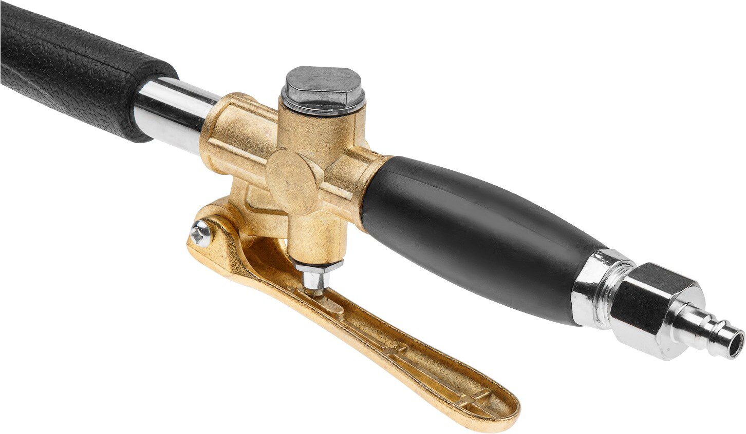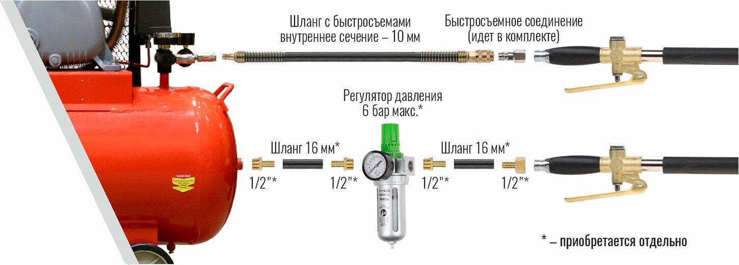 В комплекте имеется быстросъемный штуцер для удобства подключения к стандартным шлангам, но для достижения максимальной производительности рекомендуется использовать соединение “елочка” и шланг с внутренним сечением 16 мм.
