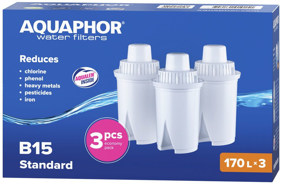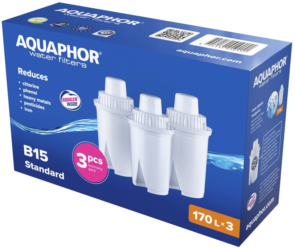 Картридж фильтрующий АКВАФОР В15 (В100-15-К) – универсальный сменный модуль для фильтров-кувшинов Аквафор Идеал, Стандарт, Лайн и некоторых кувшинов немецкого и американского производства. Надежно очищает воду от основных вредных примесей. Удаляет из воды фенол, тяжелые металлы, пестициды, железо, хлор, снижает образование накипи, удаляет неприятный запах и привкус, нефтепродукты.