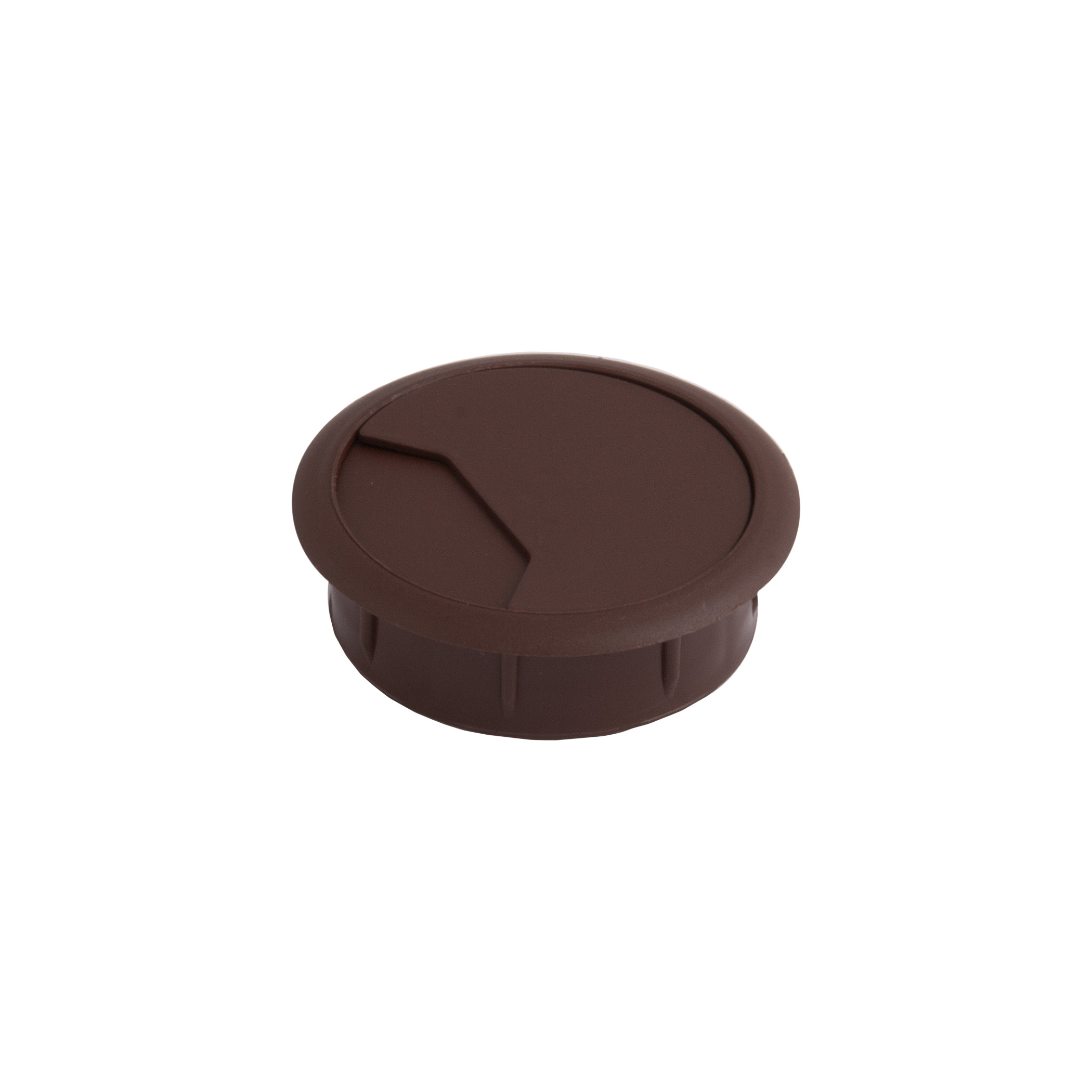 Пропуск для кабеля AKS орех темный (13379) врезной, выполнен из пластика. Размер отверстия в столешнице – d60 мм. Внутри пропуска есть съемная крышка, которая частично либо полностью закрывает отверстие для кабеля.