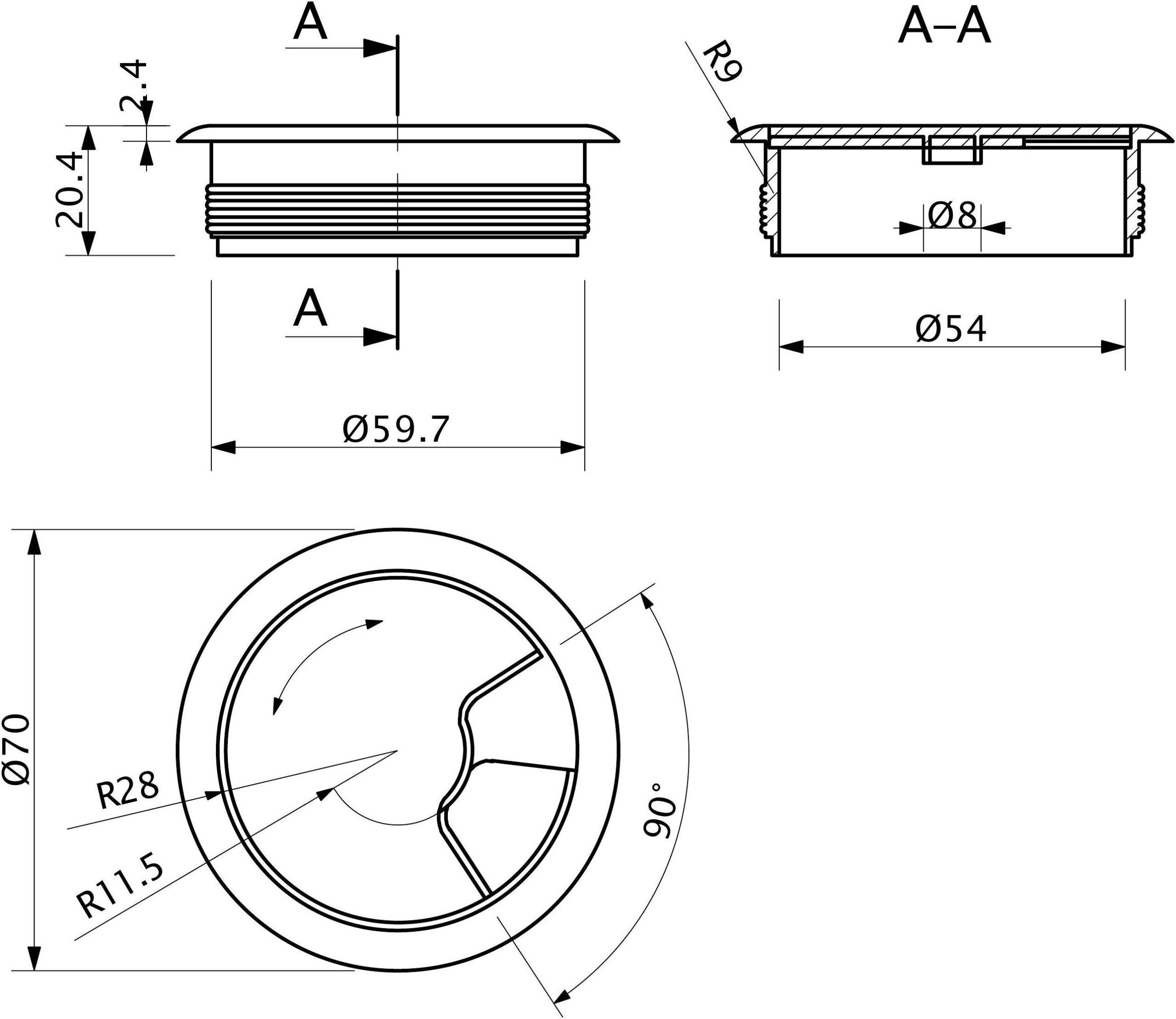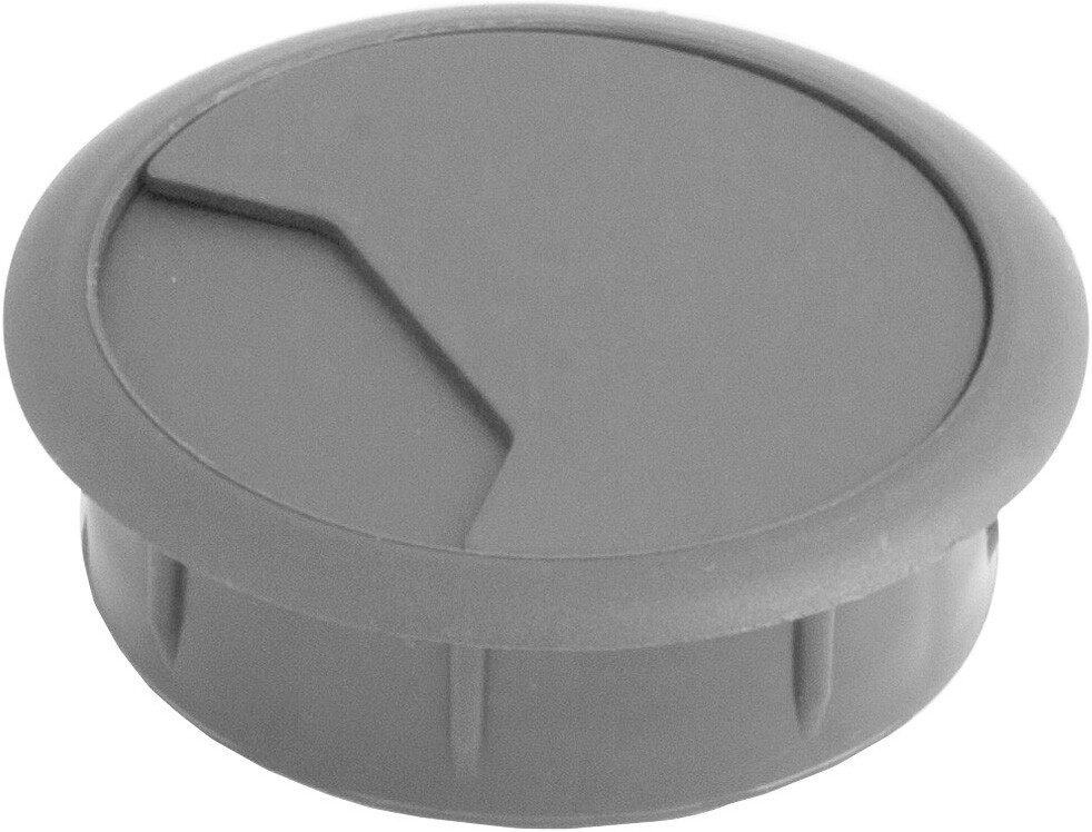 Пропуск для кабеля AKS серый (13380) врезной, выполнен из пластика. Размер отверстия в столешнице – d60 мм. Внутри пропуска есть съемная крышка, которая частично либо полностью закрывает отверстие для кабеля.