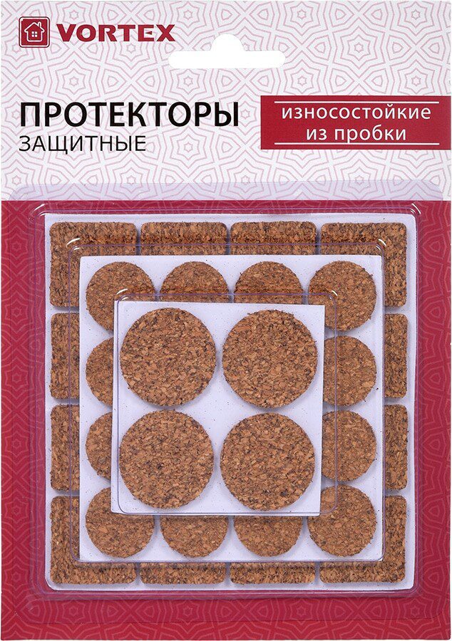 Протекторы защитные из пробки 20 мм, 28 мм, 25х25 мм VORTEX защищают поверхности пола от царапин, а также делают скольжение по гладким поверхностям более легким.В комплекте: 16 шт (20 мм), 4 шт (28 мм), 16 шт (25х25 мм).