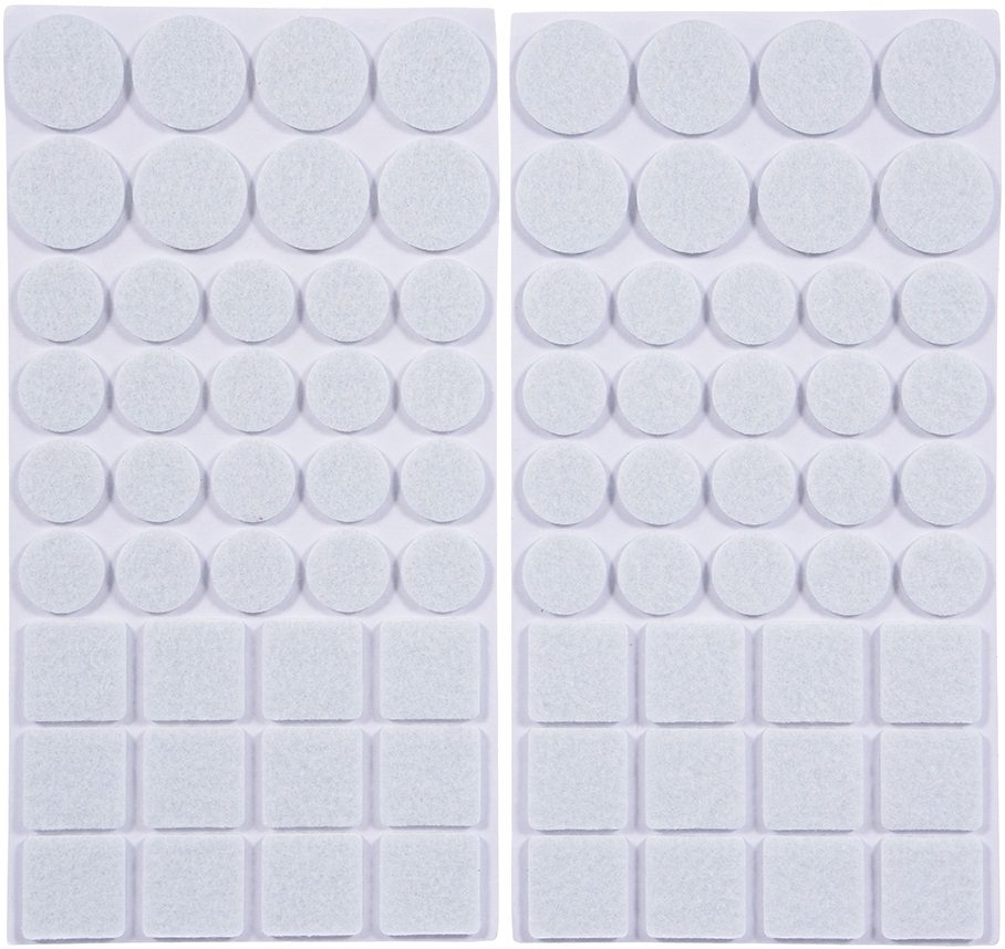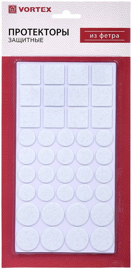 Протекторы защитные из фетра 20 мм, 27 мм, 24х24 мм, VORTEX белый (26011) защищают поверхности пола от царапин, а также делают скольжение по гладким поверхностям более легким.В комплекте: 40 шт (20 мм), 16 шт (27 мм), 24 шт (24х24 мм).