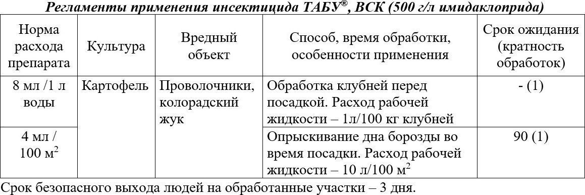 Первый способ использования препарата Табу – протравливание клубней перед посадкой. Имея в составе специальный цветовой маркер, Табу позволяет равномерно нанести раствор, контролируя объем окрашенных клубней. Табу создает на поверхности посадочного материала прочную окрашенную пленку, неосыпающуюся после высыхания. Вторым способом использования Табу является опрыскивание борозды или подготовленных под посадку лунок с разложенным картофелем. Обработанные борозды засыпаются землей со следующего ряда.