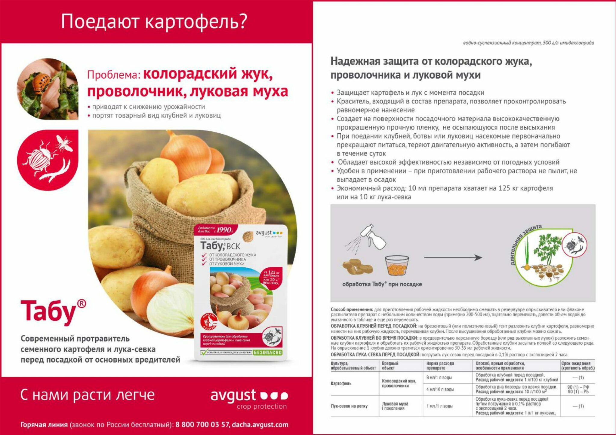 Инсектицид AVGUST Табу 10 мл ‒ современный протравитель клубней картофеля от колорадского жука, проволочника и лука-севка от луковой мухи. Обладает выраженной системной активностью, защищая растения на уязвимой стадии проростков и всходов. Имеет длительный период защитного действия. Эффективен вне зависимости от условий окружающей среды.