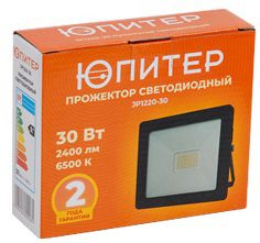 Прожектор светодиодный JP1220 30 Вт 6500K ЮПИТЕР (JP1220-30) поможет создать комфорт при отсутствии естественного света. Применяется для организации зонального и общего освещения коммерческих, промышленных и жилых объектов, фонтанов, ландшафтной архитектуры. Прожектор имеет прочный литой алюминиевый корпус и закаленное стекло, что позволяет его использование в условиях агрессивной окружающей среды. Световой поток рассеивается на 110 градусов, что позволяет максимально охватить подсвечиваемую поверхность. Срок службы – 30000 часов. Тип кабеля – КГ 3х1.0 мм2 (H05RN-F 3G1.0mm2), длина кабеля – 15 см.