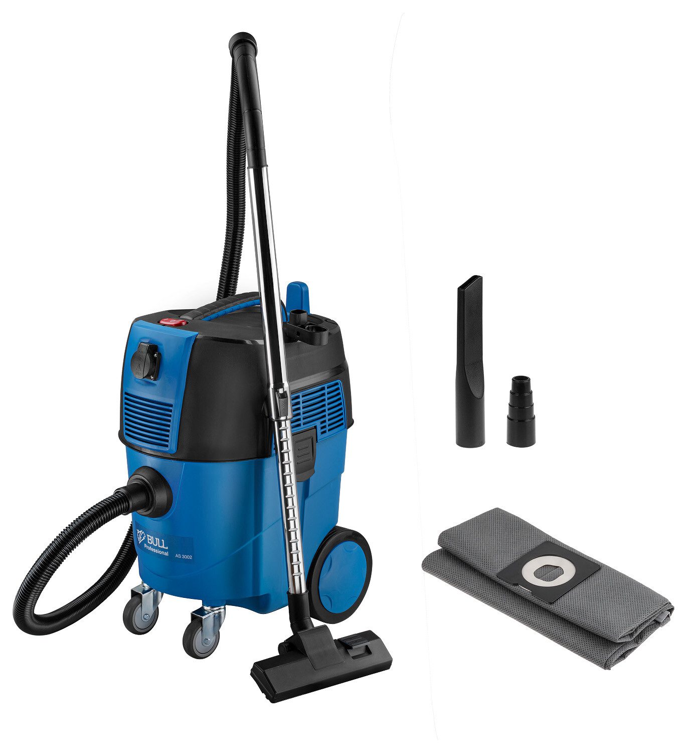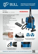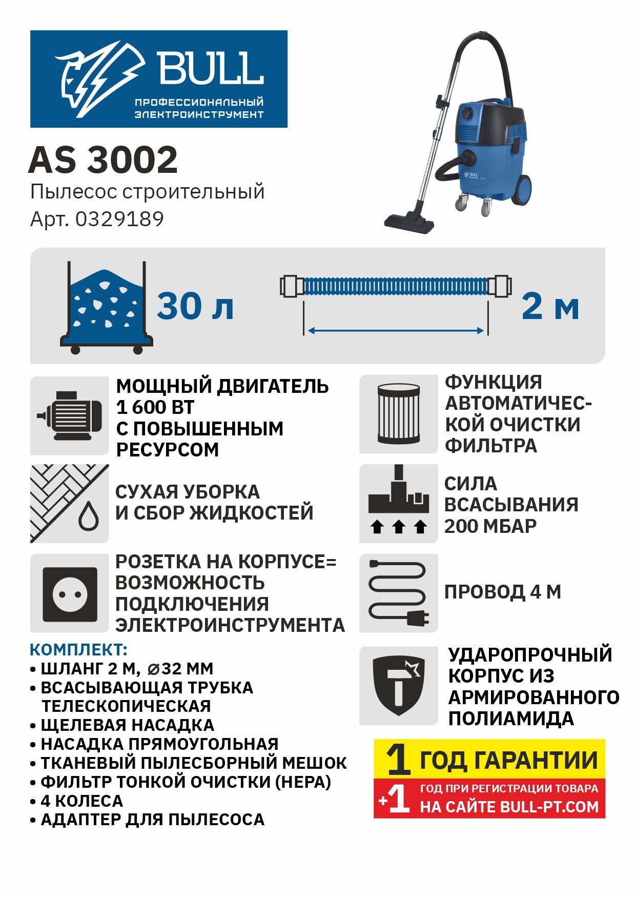 Пылесос строительный BULL AS 3002 (0329189) — мощный профессиональный пылесос для сухой чистки и сбора жидкости. Двигатель 1600 Вт с увеличенным ресурсом при высоких нагрузках. Так же предусмотрено эффективное охлаждение двигателя двумя вентиляторами, что значительно продлит срок его службы. Имеется розетка для работы с электроинструментом. Для удобства в работе предусмотрен шланг длиной 2 м и кабель 4 м. Оснащен функцией автоматической очистки фильтра, пылесос сам встряхивает фильтр (примерно каждые 20-30 секунд), это можно заметить по характерному звуку. Данная функция обеспечивает постоянно высокую силу всасывания на протяжении всего рабочего процесса без потери мощности.