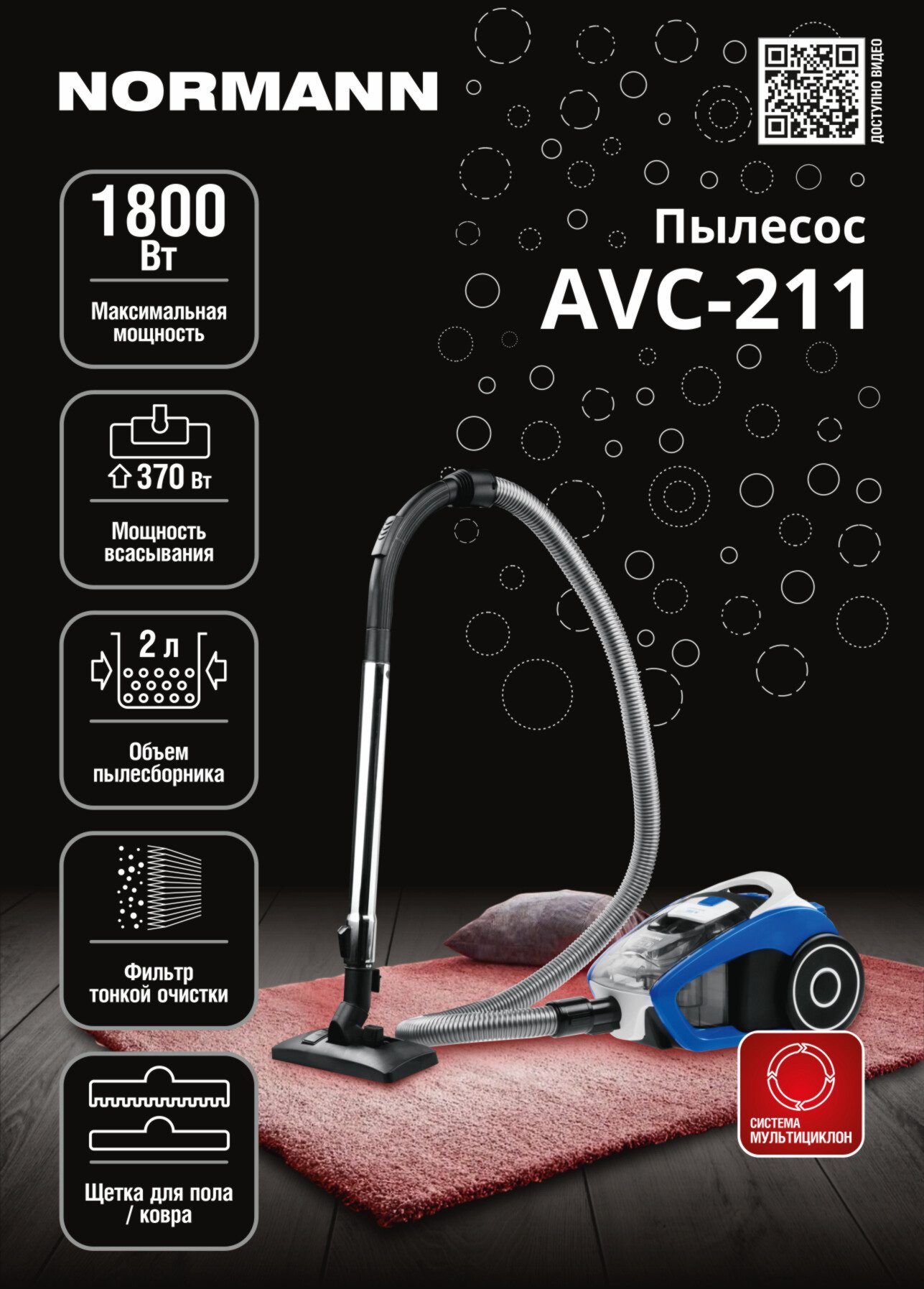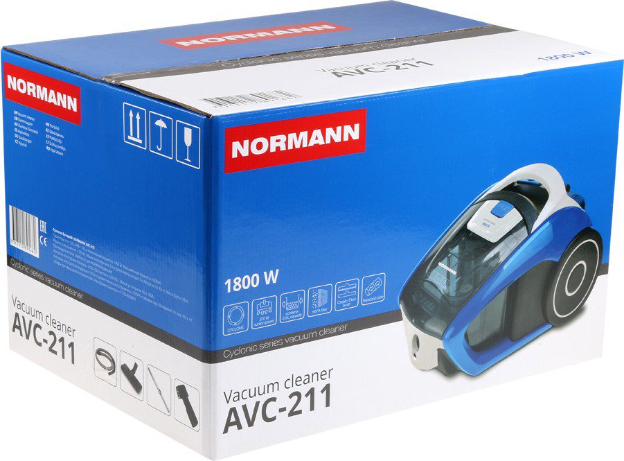 Пылесос бытовой NORMANN AVC-211 — достаточно мощное устройство с циклонным фильтром и хорошими показателями по потребляемой мощности и мощности всасывания. Пылесос оснащен телескопической трубой всасывания, поэтому им легче управлять и проще хранить. В комплекте есть комбинированная щетка для пола/ковра и комбинированная насадка для щелей/мебели. Тип пылесборника: контейнер с циклонным фильтром (НЕРА). Двухлитровый контейнер для мусора позволяет реже производить очистку пылесоса. Длина сетевого шнура 5 м.