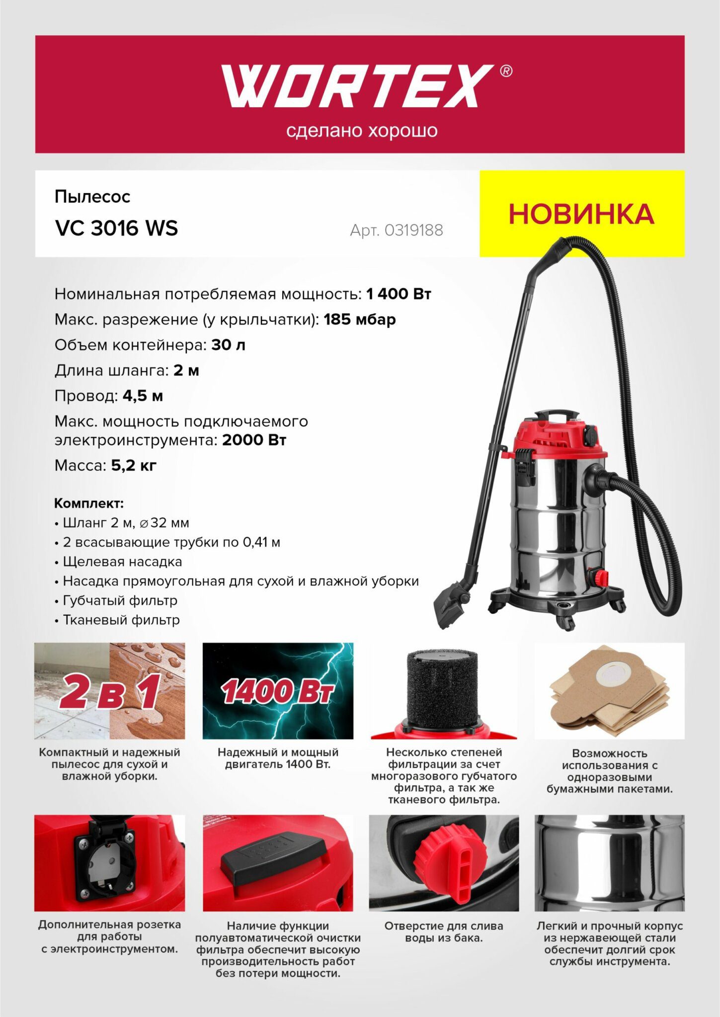 Пылесос строительный WORTEX VC 3016 WS (0319188) – это компактный и надежный пылесос для сухой и влажной уборки, а так же с дополнительной розеткой для работы с электроинструментом. В базовую комплектацию входит шланг 2 м и электрический провод 4,5 м для большего удобства в работе. Надежный и мощный двигатель 1400 Вт.
