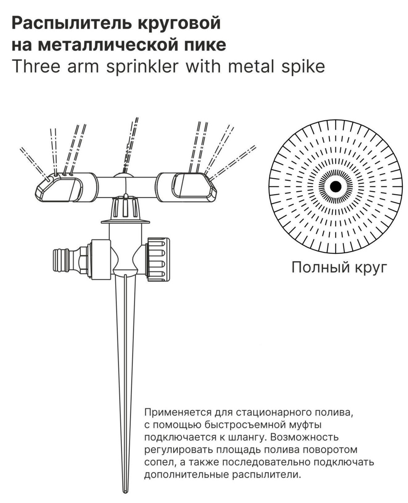 Распылитель круговой на металлической пике STARTUL GARDEN предназначен для стационарного полива растений, работает в одном режиме, имеет возможность регулировать рабочую площадь поворотом сопел и последовательно подсоединять дополнительные распылители. Присоединяется к шлангу через быстросъемную муфту, которая подбирается по диаметру шланга. Распылитель оснащен металлической ножкой в форме пики для надежной фиксации в земле.. Орошающая часть инструмента выполнена из пластика.