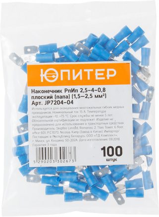 Кабельный наконечник ЮПИТЕР РпИп 2,5-4-0,8 2,5 мм2 100 штук (JP7204-04) предназначен для монтажа быстроразъемных соединений многопроволочных гибких медных проводов методом опрессовки Поперечные засечки на внутренней поверхности трубной части разъемов увеличивают механическую прочность соединения с жилой. Каждая клемма имеет конструктивный фиксатор замкового типа для прочного механического соединения с разъемом «мама».