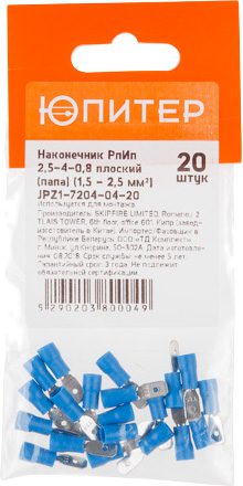 Кабельный наконечник ЮПИТЕР РпИп 2,5-4-0,8 2,5 мм2 20 штук (JPZ1-7204-04-20) предназначен для монтажа быстроразъемных соединений многопроволочных гибких медных проводов методом опрессовки Поперечные засечки на внутренней поверхности трубной части разъемов увеличивают механическую прочность соединения с жилой. Каждая клемма имеет конструктивный фиксатор замкового типа для прочного механического соединения с разъемом «мама».