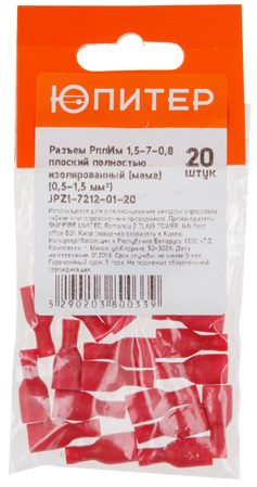 Кабельный наконечник ЮПИТЕР РппИм 1,5-7-0,8 1,5 мм2 20 штук (JPZ1-7212-01-20) предназначен для формирования изолированных разъемных соединений цепи по принципу «вилка-розетка». Оперативное замыкание/размыкание цепи. Полная изоляция контакта. Замковый механизм.