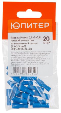 Кабельный наконечник ЮПИТЕР РппИм 2,5-5-0,8 2,5 мм2 20 штук (JPZ1-7212-02-20) предназначен для формирования изолированных разъемных соединений цепи по принципу «вилка-розетка». Оперативное замыкание/размыкание цепи. Полная изоляция контакта. Замковый механизм.