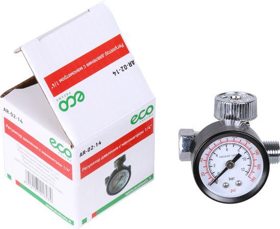 Регулятор давления с манометром ECO AR-02-14 Габариты (ДхШхВ), см: 6 x 6 x 6. Вес с упаковкой: 0.143 кг.
