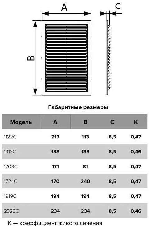 Решетка вентиляционная ЭРА 110х220 1122С используется в приточных или вытяжных вентиляционных системах любых зданий. Решетка имеет наклонные жалюзи. Монтируется на стену при помощи клея. Материал изготовления — АВС-пластик. Защитной сетки от насекомых в данной модели нет. Монтажный размер (максимальный размер вентиляционного отверстия): 100х205 мм.