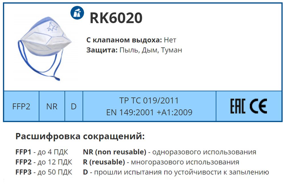 Респиратор РК RK6020 без клапана FFP2 до 12 ПДК (RK6020) — складной фильтрующий респиратор с регулируемыми лентами оголовья без клапана выдоха, аналог респиратора НЕВА-200 (новая улучшенная разработка). Предназначен для индивидуальной защиты органов дыхания человека от всех видов аэрозолей (пыль, дым туман) при их концентрации до 12 ПДК. Рекомендуемые области применения: чугунное и сталелитейное производство, машиностроение, строительство, судостроение, сельское хозяйство и др. Особенности: регулируемые ленты оголовья с фиксатором; идентификация класса защиты на корпусе полумаски. Класс защиты: FFP2 NR D (FFP2 — до 12 ПДК; NR, non reusable — одноразового использования; D — прошли испытания по устойчивости к запылению).Стандарт: ТР ТС 019/2011. ГОСТ 12.4.294-2015. EN 149:2001 +A1:2009. Упаковка: индивидуальная. Количество в транспортной упаковке (коробке): 400 шт.