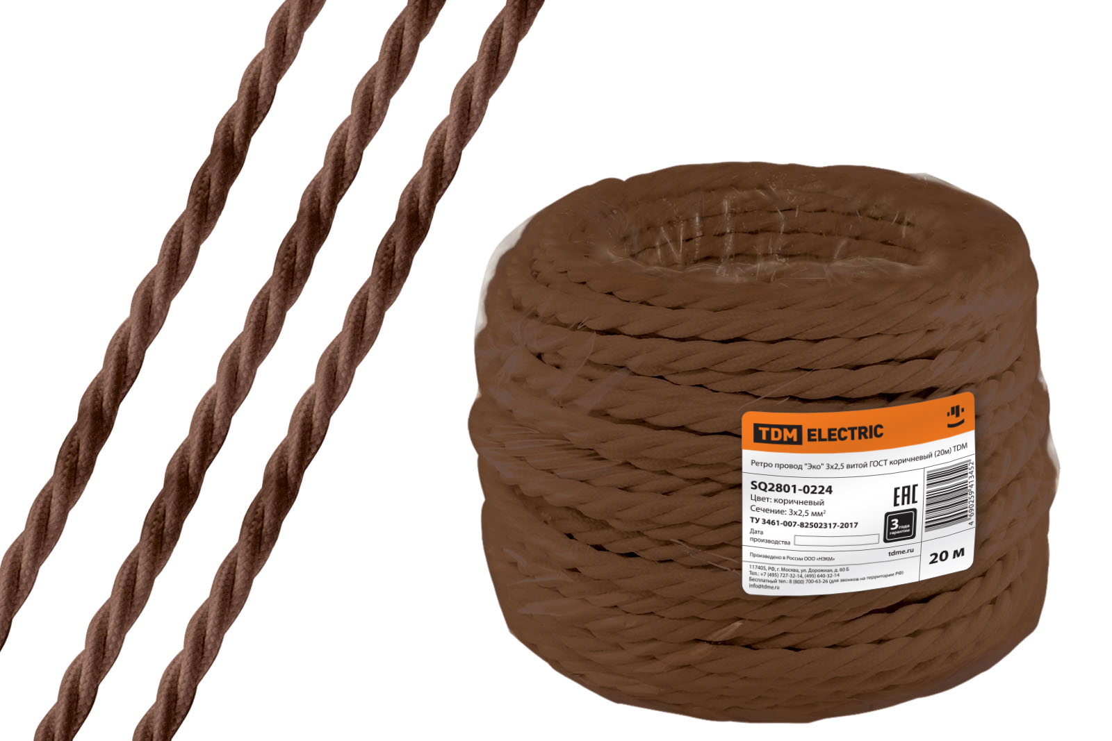 Ретро провод TDM “Эко” 3×2,5 витой ГОСТ применяется для открытого монтажа проводки в стиле ретро, передачи и распределения электрической энергии на номинальное переменное напряжение до 450/750 В. Идеально подходит для деревянных домов, где провода нельзя монтировать в стены. Возможность прокладки в строящихся деревянных домах, нет необходимости ждать усадки дома. Возможность создания стильного интерьера в помещениях декорированных деревом.