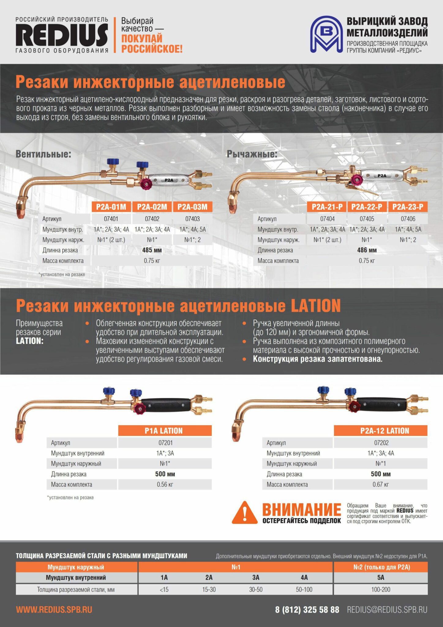 Резак ацетиленовый РЕДИУС Р2А-02М (07402) предназначен для ручной газокислородной резки листового и сортового металла из низкоуглеродистых сталей. Максимальная толщина разрезаемого металла – до 300 мм. Для присоединения используется ниппель 6/9 мм. Вентильная подача газа, щелевое сопло. Алюминиевая рукоятка, конус штока из нержавеющей стали. 100% стойкость к обратным ударам пламени. Длительный срок службы. Резак выполнен разборным и имеет возможность замены наконечника в случае его выхода из строя, без замены вентильного блока и рукоятки.