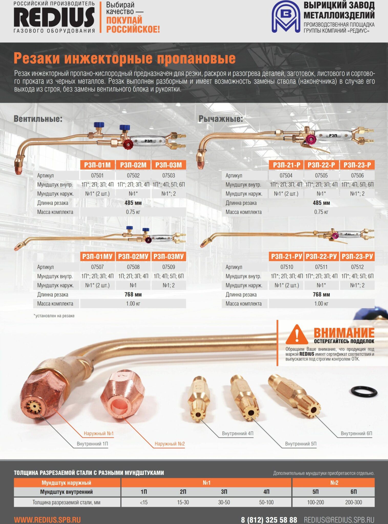 Резак пропановый РЕДИУС Р3П-02М (2302Р3М-REDIUS-02) служит для ручной газокислородной разделительной резки низкоуглеродистых сталей. Рекомендован для работ с повторно-кратковременным режимом резки: резка металлолома; монтажные работы; ремонтные работы. Применяется горючий газ пропан-бутан. Максимальная толщина разрезаемого металла – до 100 мм. Для присоединения используется ниппель 9 мм. Высокая безопасность при резке, 100% стойкость к обратным ударам пламени. Длительный срок службы. Резак выполнен разборным и имеет возможность замены наконечника в случае его выхода из строя, без замены вентильного блока и рукоятки.