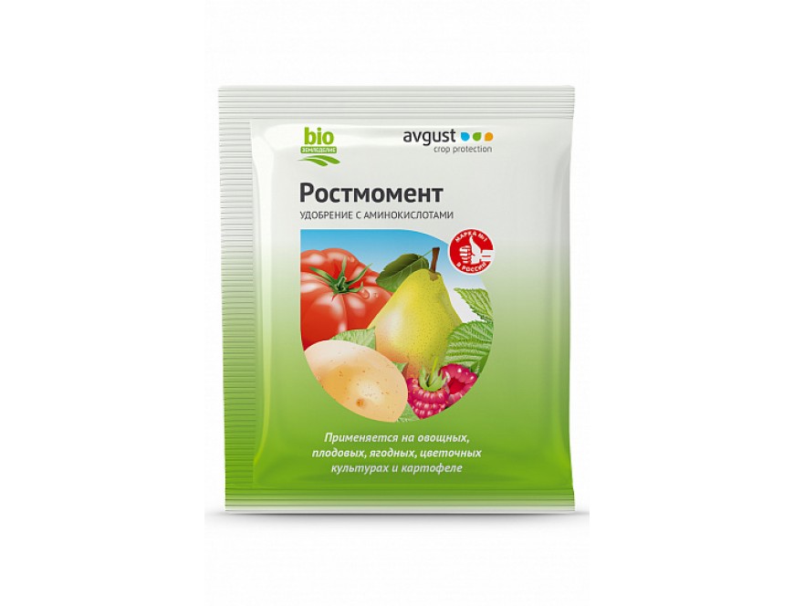 Регулятор роста АГРОМАРКЕТ Ростмомент 100 гр увеличивает урожайность. Ускоряет развитие и рост плодовых, ягодных и овощных культур. Повышает защитные функции растений к неблагоприятным погодным условиям (возвратные заморозки, засуха и др.). Способствует длительному и пышному цветению. Экологически безопасен для человека и окружающей среды. Создан на основе дрожжей (хлебопекарных, пивных, винных), известных своими свойствами улучшать почвенную микрофлору и способствовать размножению полезных микроорганизмов. В составе содержит аминокислоты, необходимые для формирования белков и позволяющие обеспечить высокий уровень усвоения питательных элементов.