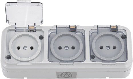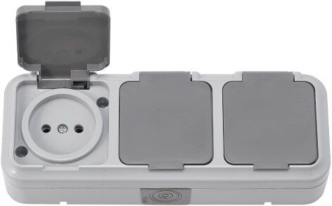 Розетка тройная наружная брызгозащищенная BYLECTRICA Пралеска Аква серая (РА16-0131(03)) с установочными размерами (расстояние между отверстиями): 173±0,2х53±0,2 мм. Климатическое исполнение: УХЛ4. Номинальное напряжение: 220..250 В. Сечение присоединяемых проводников: от 1,5 до 2,5 мм².