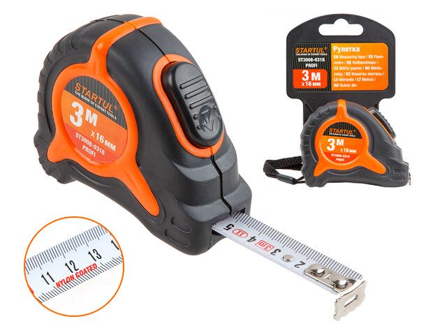 Рулетка 3 м STARTUL Profi ST3008-0316 имеет прорезиненный корпус, защищающий инструмент от повреждения. Лента стальная, сматывается автоматически. Полотно гнется на 90 градусов без излома. Рулеткой удобно пользоваться при проведении измерений. Концевой крючок с отверстием. Автоматическая намотка ленты, стопорный механизм, крепление к ремню делают работу с инструментом удобной.