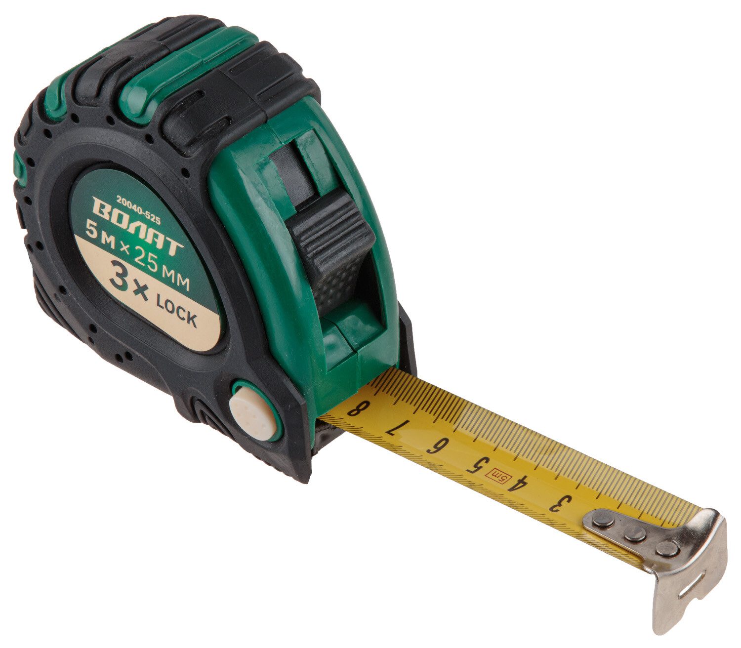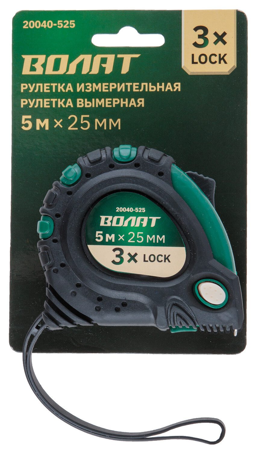 Рулетка 5 м ВОЛАТ (20040-525) применяется при выполнении измерительных или разметочных работ. Корпус рулетки изготовлен из современного ABS-пластика и снабжен обрезиненным чехлом. Эргономичное устройство рулетки включает три независимых механизма фиксирования ленты, что делает работу с рулеткой наиболее удобной.