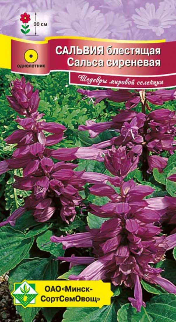 Семена сальвии блестящей Сальса сиреневая МИНСКСОРТСЕМОВОЩ 10 штук – это однолетнее растение высотой около 30 см. Сиреневые соцветия-кисти словно парят над темно-зеленой ажурной листвой, придавая неповторимое очарование клумбам, рабаткам, делают сальвию незаменимой участницей парада цветов в саду. Цветет очень обильно, ярко и продолжительно. Семена на рассаду высевают в марте. В открытый грунт рассаду высаживают с конца мая. Светолюбива, но выносит и легкую полутень.
