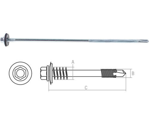 Саморез для сэндвич-панелей цинк шайба с прокладкой STARFIX применяется для прямого монтажа сэндвич-панелей на стальные конструкции. Сверло РТ5. Изделие имеет резьбу с частым шагом и наконечник-сверло. В комплекте с саморезом идет резиновая прокладка из EDPM, которая обеспечивает максимальную гидроизоляцию крепежа и детали. Саморез изготовлен из оцинкованной стали. Максимальная толщина просверливаемого материала – 12 мм. Размеры А/ВхС, мм: 6.3/5.5х185.