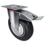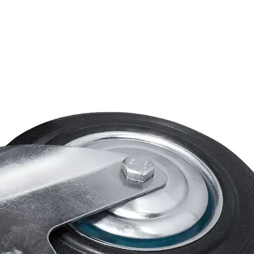 Колесо серии SCb 63 со стальным оцинкованным ободом и литой резиновой шинкой. Колесо имеет Ø 160 мм, ширина обода 36 мм, с роликовым подшипником. Кронштейн с крепёжной площадкой выполнен из оцинкованной стали. На кронштейн крепится металлический тормоз. В поворотном узле двухрядный шариковый подшипник, защищённый пластиковым пыльником. Грузоподъёмность 150 кг достаточна для эксплуатации в платформенных тележках, строительных лесах, вышках-турах, контейнерах ТБО.