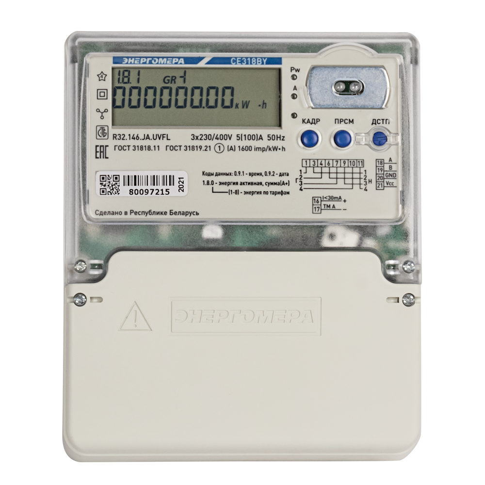 Счетчик электроэнергии трехфазный ЭНЕРГОМЕРА СЕ 318 BY R32.146.JR.UVFL – счетчик активной и реактивной электрической энергии трехфазный, предназначен для измерения активной и реактивной электрической энергии, активной, реактивной и полной мощности, частоты напряжения, углов между векторами фазных напряжений и векторами фазных токов и напряжений, среднеквадратического значения напряжения, силы тока, в трехфазных четырехпроводных цепях переменного тока и организации многотарифного учета электроэнергии.