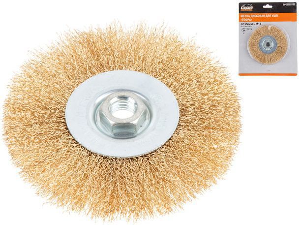 Щетка для УШМ диск гофра 125 мм M14 GEPARD (GP0892-125) предназначена для очистки поверхностей от ржавчины, грязи, удаления лакокрасочных покрытий, получения заданной шероховатости. Подходит для УШМ. Форма: плоская. Диаметр проволоки 0,3 мм. Тип проволоки: стальная латунированная, витая, гофрированная.
