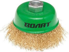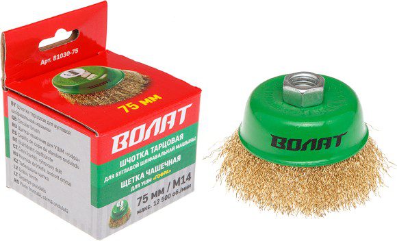 Щетка для УШМ чашка гофра 75 мм M14 ВОЛАТ (81030-75) применяется для очистки поверхностей от ржавчины, грязи, удаления лакокрасочных покрытий, получения заданной шероховатости. Диаметр проволоки составляет 0,3 мм. Посадка: М14.