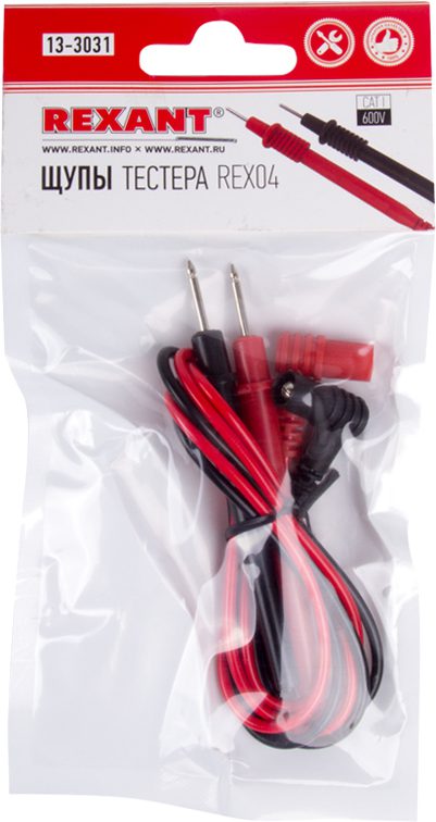 Щупы REXANT REX04 (13-3031) для тестера и токовых клещей. Они подсоединяются к гнездам мультиметра, для удобства имеют разные цвета: черный и красный. Как правило, черный щуп подключается на общее гнездо, а красный на гнезда “+”. Клеммы, провода и ручки щупов надежно изолированы для защиты пользователя от поражения электрическим током. Для удобства работы металлические концы щупов заострены.Класс защиты от перенапряжения: категория 1 до 600В 10АДлина: 720 ммДлина рукояти от защитной гарды: 63 ммДлина жала: 15 ммДлина штекера: 10 ммДиаметр штекера: 8 ммУгол штекера: 90 градусов (прямой)Подходят для недорогих приборов с коротким посадочным гнездом, серий Mastech, Proconnect 830, 832, 838 и т.п.
