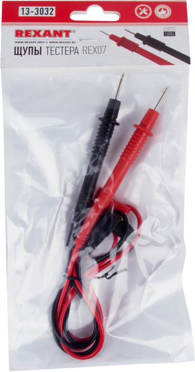 Щупы REXANT REX07 (13-3032) для тестера и токовых клещей. Они подсоединяются к гнездам мультиметра, для удобства имеют разные цвета: черный и красный. Как правило, черный щуп подключается на общее гнездо, а красный на гнезда “+”. Клеммы, провода и ручки щупов надежно изолированы для защиты пользователя от поражения электрическим током. Для удобства работы металлические концы щупов заострены.Класс защиты от перенапряжения: категория 2 до 1000В 10АДлина: 850 ммДлина рукояти от защитной гарды: 82 ммДлина жала: 17 ммДлина штекера: 13 ммДиаметр штекера: 8 ммУгол штекера: 90 градусов (прямой)Подходят для недорогих приборов с коротким посадочным гнездом, серий Mastech, Proconnect 830, 832, 838 и т.п.