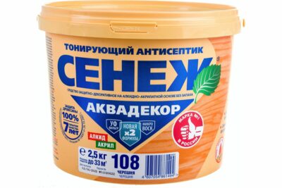 Антисептик СЕНЕЖ Аквадекор формирует яркие насыщенные оттенки уже при малых расходах. Отлично наносится даже новичками без опыта. Новая усиленная х2 формула для сложных природно-климатических условий. Сочетание в одном составе алкидов, акрилатов и масла повышает надежность. Предохраняет древесину от ультрафиолетовых лучей UV-A и UV-B. Современная популярная гамма из 18 стойких декоративных оттенков. Двойная микро восковая композиция активно отталкивает воду и грязь. Подчеркивает, декорирует и сохраняет текстуру древесины. Продукт без растворителей и запаха. Пожаро-, взрыво- безопасный материал.