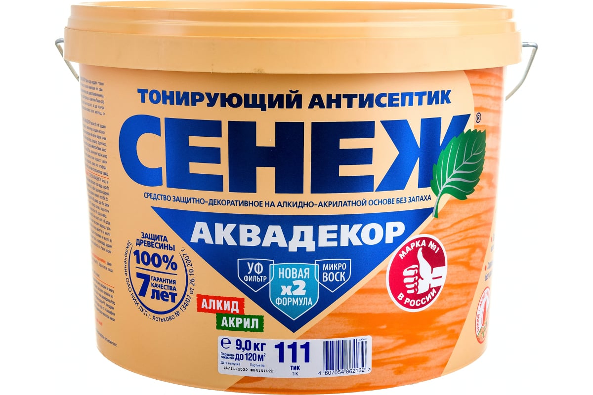 Главная Лакокрасочные материалы Покрытия для дерева СЕНЕЖ АКВАДЕКОР 9 кг – Тонирующий антисептик д/древесины (Х2-111, тик)