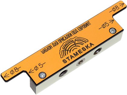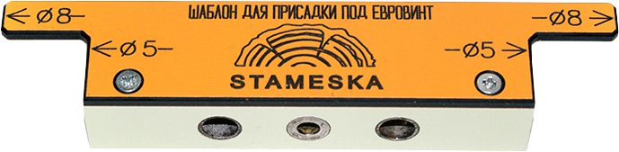 Шаблон для присадки под конфирмат СТАМЕСКА (ST.05.01) Мебельный шаблон под конфирмат ST.05.01 выполнен из ударопрочного, влагостойкого пластика и предназначен для быстрой и точной присадки под евровинт (конфирмат).Для сборки мебели на евровинт (конфирмат) вам потребуется.Шаблон для сверления, сверло проходное диаметром 8 мм и 5 мм или комбинированное сверло под (конфирмат). Дрель или шуруповерт. Струбцина для надежной фиксации шаблона.Как пользоваться мебельным шаблоном STAMESKA ST.05.01:1. Сверление в торец заготовки:a. Приложите шаблон к краю заготовки (справа и слева). Просверлите отверстия через центральную втулку сверлом диаметром 5 мм. (использовать можно специальное комбинирование сверло для евровинтов, так и простое сверло по дереву диаметром 5 мм.) Для надежной фиксации шаблона рекомендуется использовать струбцину.2. Сверление в пласте заготовки:a. При использовании комбинированного сверла для евровинтов, располагайте шаблон относительно края также, как и для сверления в торце заготовки. После сверления диаметром 5 мм. Убрать шаблон и просверлить заготовку комбинированным сверлом на всю длину.b. При использовании сверла диаметром 8 мм. Шаблон базируем по отметки диаметром 8 мм и сверлим насквозь через втулку диаметром 8 мм. Рекомендуем использовать проходное сверло и струбцину для надежной фиксации шаблона.3. После засверливания всех отверстий произвести сборку изделия.Этот шаблон идет только под 18 мм.