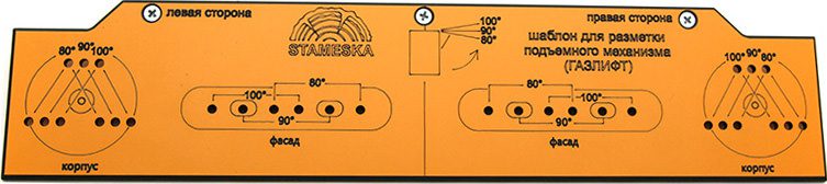 Шаблон для разметки СТАМЕСКА Газлифт (ST.02.01) позволяет произвести разметку подъемного механизма для фасадов с открытием 80°, 90° и 100°. Изготовлен из ламинированного текстолита толщиной 3мм. Упорная планка из пластика. Габаритные размеры 270х60 мм.С помощью шаблона «STAMESKA ST.02.01» можно производить разметку на корпусе и фасаде изделия. Если у вас есть сомнения что данный шаблон подойдет вам, советуем померить максимальное расстояние вашего газлифта. Если он 260 мм, то не сомневайтесь шаблон подойдет.Мы рекомендуем использовать ST.02.01 на уже собранном корпусе изделия. В разобранном варианте вы так же сможете его использовать.Толщина короба ЛДСП под которую разработан шаблон – 18 мм. Толщина фасадов не имеет значения.Шаблон разделен на 2 части. Одна часть предназначена для разметки левого подъемного механизма «Левая сторона», а вторая для правого механизма «Правая сторона».1. Приложите к левому боку короба шаблон (стороной с надписью Правый газлифт) совместив упор шаблона к фасадной (передней) части. Сдвиньте шаблон вверх заподлицо с крышей короба, указанной стрелкой. Шилом или карандашом произведите отметку в нижней (круглой) части шаблона, под необходимым вам градусом открывания фасада (80/90/100).2. Поместите шаблон на тыльную сторону левой стороны фасада, по стрелке на рисунке. Шилом или карандашом произведите разметку в секции помеченной буквой «Левая сторона» под необходимым вам градусом открывания фасада (80/90/100). Перевернув шаблон вверх ногами, произведите те же действия, только для правого газлифта и с пометкой «Правая сторона».Установите крепежные планки саморезами 3,5×16 мм. Оденьте газлифт до щелчка.Если вы ошиблись с углом открывания фасада и уже прикрути металлическую планку, то вы можете ослабить крепящие винты и сдвинуть планку, находящаяся на фасаде, до упора в верх или вниз, в зависимости от того как вы хотите чтобы открывался фасад.