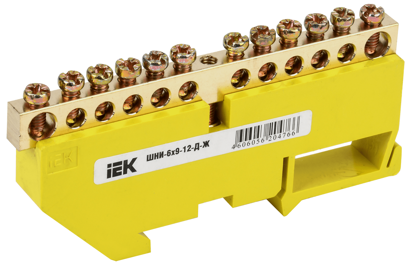 Шина PE заземления с изолятором на DIN-рейку ШНИ 6х9 мм 12 групп IEK предназначена для электрического и механического соединения нулевых, защитных и фазных проводников. Конструктивно шина ШНИ выполнена из латунной шины, установленной на пластиковый изолятор или в изолятор, изготовленный из самозатухающего пластика.