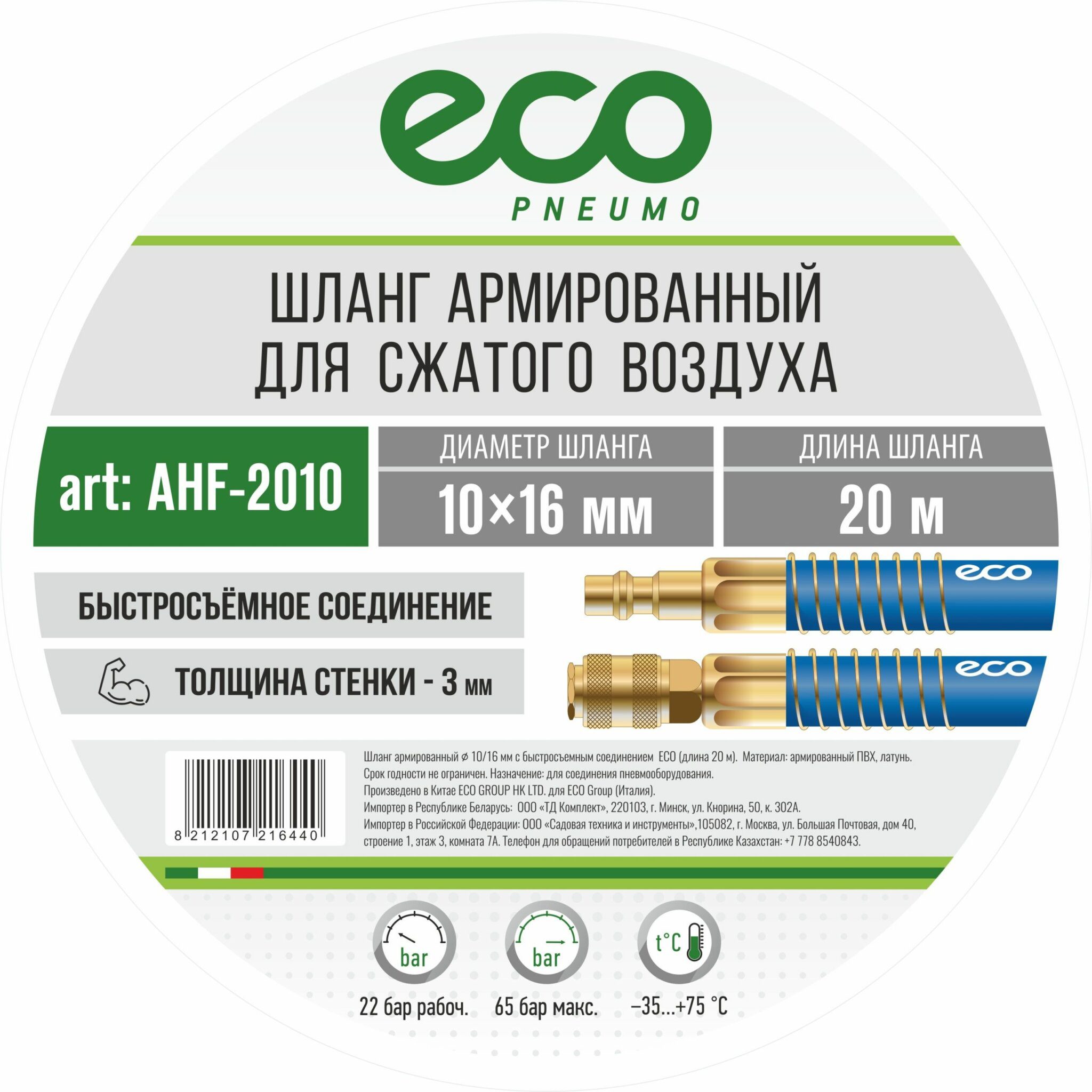 Шланг ПВХ армированный ECO 10/16 мм 20 м с быстросъемами (AHF-2010) Шланги оборудованы латунными быстросъемными соединениями ПАПА и МАМА. Материал шланга имеет широкий диапазон рабочих температур благодаря добавлению запатентованных эластомеров. Материал шланга устойчив к воздействию ультрафиолета.