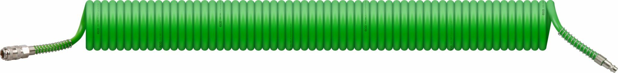 Шланг полиуретановый спиральный ECO 8/12 мм 15 м с быстросъемами (AHU-1580) оснащен быстросъемными соединителями и применяется для соединения пневматического инструмента с компрессорами и линиями подачи сжатого воздуха. Благодаря спиральной форме шланг способен растягиваться и сжиматься по принципу пружины, что предотвращает его запутывание и переламывание.
