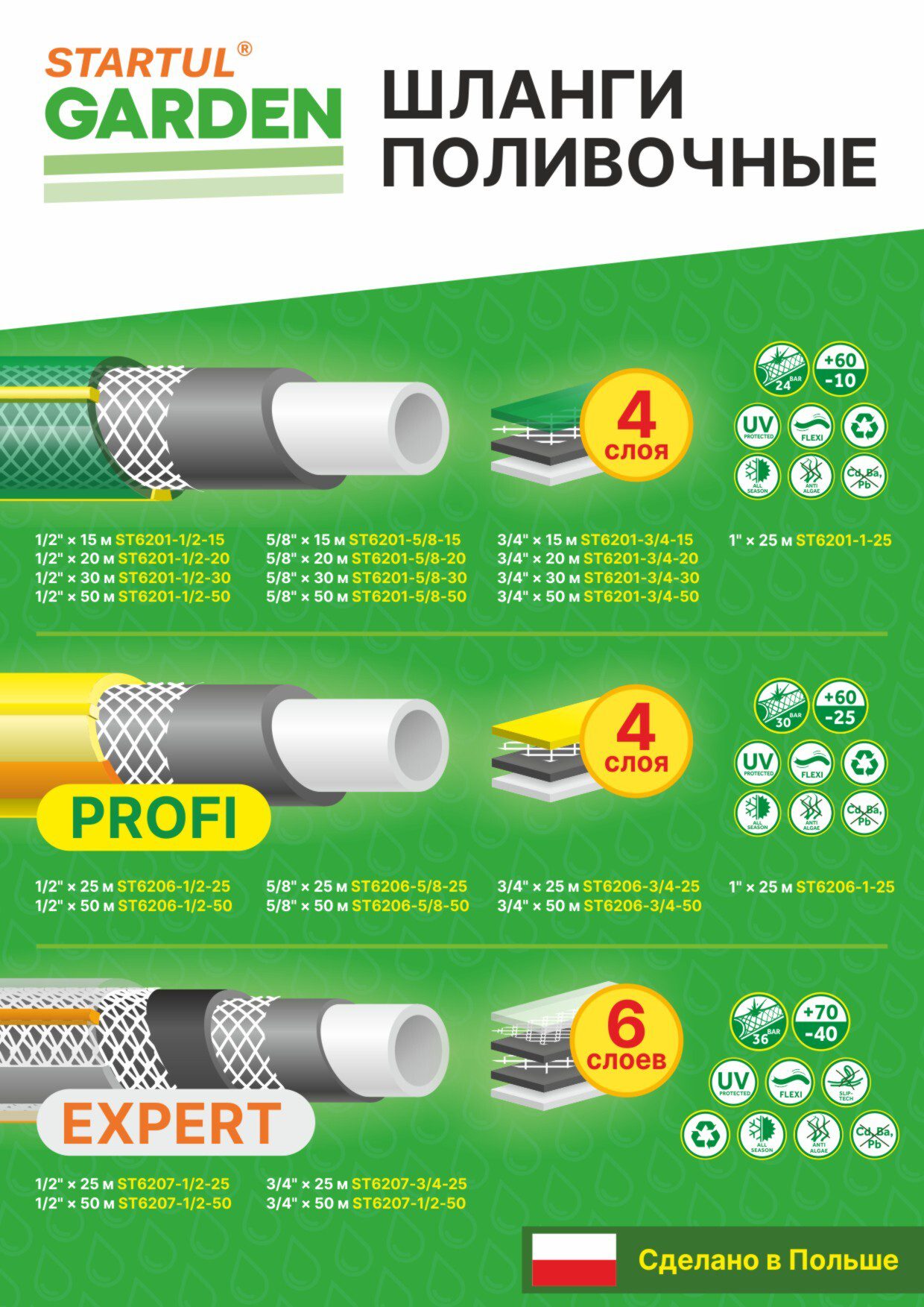 Шланг поливочный STARTUL Garden Profi 3/4″ 50 м (ST6206-3/4-50) состоит из четырех слоев, с одной армирующей оплеткой. Специальное покрытие не дает шлангу перегибаться и перекручиваться. Невосприимчив к ультрафиолету. Выдерживает температуры от -25˚С до +60˚С. Перед хранением необходимо слить воду.Рабочее давление: 10 бар (при 20 градусах Цельсия).Давление разрыва: 30 бар.