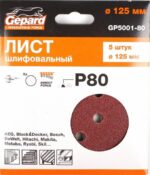 Шлифлист круглый самосцепляющийся 125 мм Р80 GEPARD 5 штук (GP5001-80) используется для эксцентриковых шлифмашин и предназначен для шлифования металла, дерева, пластика и других материалов. 8 технологических отверстий обеспечивают быстрое удаление пыли. 5 штук в упаковке.